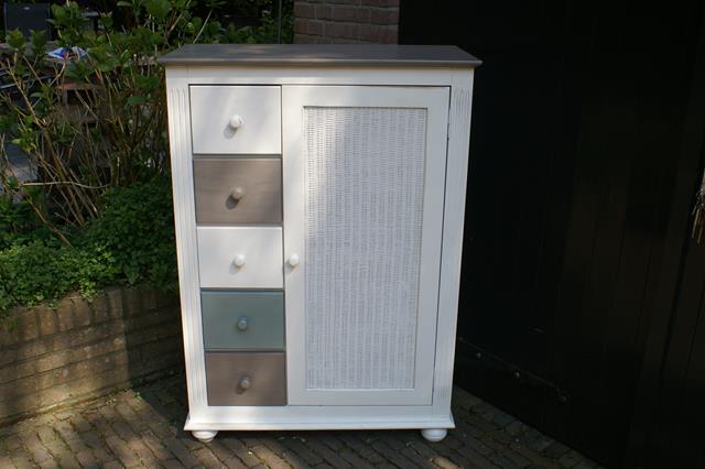 Op zich vond ik deze meidenkast/spekkast best wel leuk, maar het rieten deurtje maakte het kastje een beetje goedkoop. En al die verschillende kleurtjes zijn leuk maar gaan op den duur vervelen. Door het kastje in 1 kleur te verven, het riet te vervangen door hard board en er mooie oude knopjes op te zetten, ziet het meteen veel chiquer uit.
