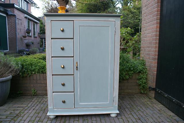 Deze kast heb ik opgeknapt voor de Milou, de dochter van een vriendin. Toen ze zelf nog thuis woonde, heeft deze kast altijd op haar kamer gestaan, maar nu stond de kast al een tijd in de kelder. Op de vraag of ik deze wilde pimpen voor haar dochter hoefde ik niet lang na te denken. Ik heb een combinatie gebruikt van Aubusson Blue en Louis Blue en de hele kast afgewerkt met softwax. De binnenkant van de lades heb ik beplakt met lichtblauw bloemetjes papier en nieuwe kettinkjes bevestigd aan de klep. In combinatie met de brocante bidstoel een plaatje! Milou is mijn meest enthousiaste klant tot nu toe want ze hing zwaaiend uit het raam toen ik hem kwam afleveren.