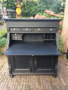 De afgelopen paar maanden zijn voorbij gevlogen. Ik heb een aantal leuke opdrachten gehad om meubels te restylen. Hiernonder zie je de secretaire van Noortje. Eigenlijk wilde zij hem geschilderd hebben in de kleur duck egg blue, maar toen haar man een kleinere secretaire in de kleur graphite in de schuur zag staan, waren ze om.