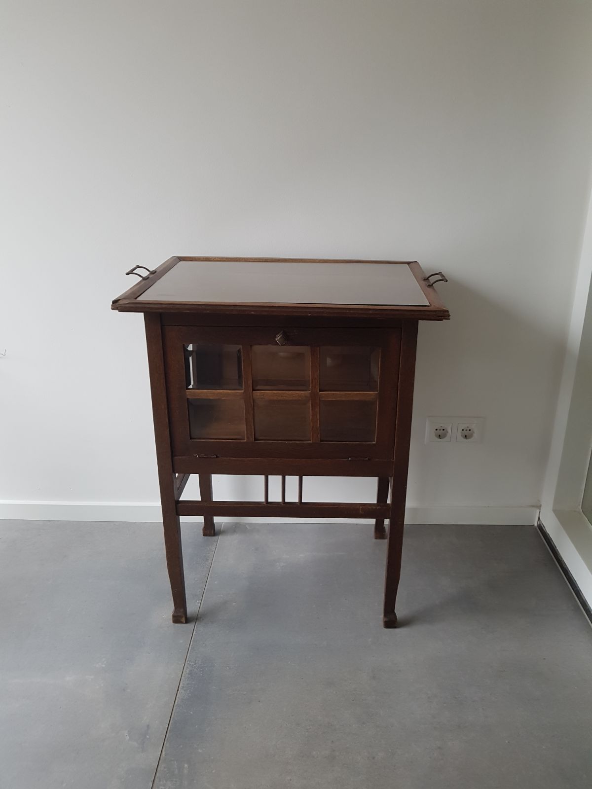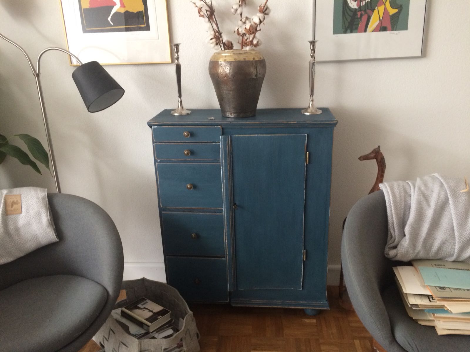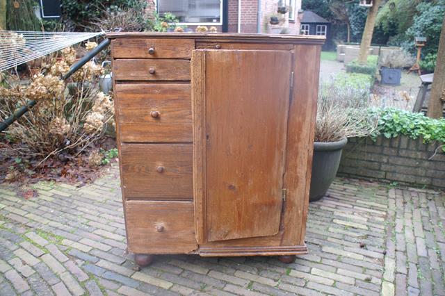 Heel oud kastje van de oma van Bernadette. Bijna opgegeten door houtworm, deur zo krom als een hoepel en poten die er spontaan onderuit vielen.