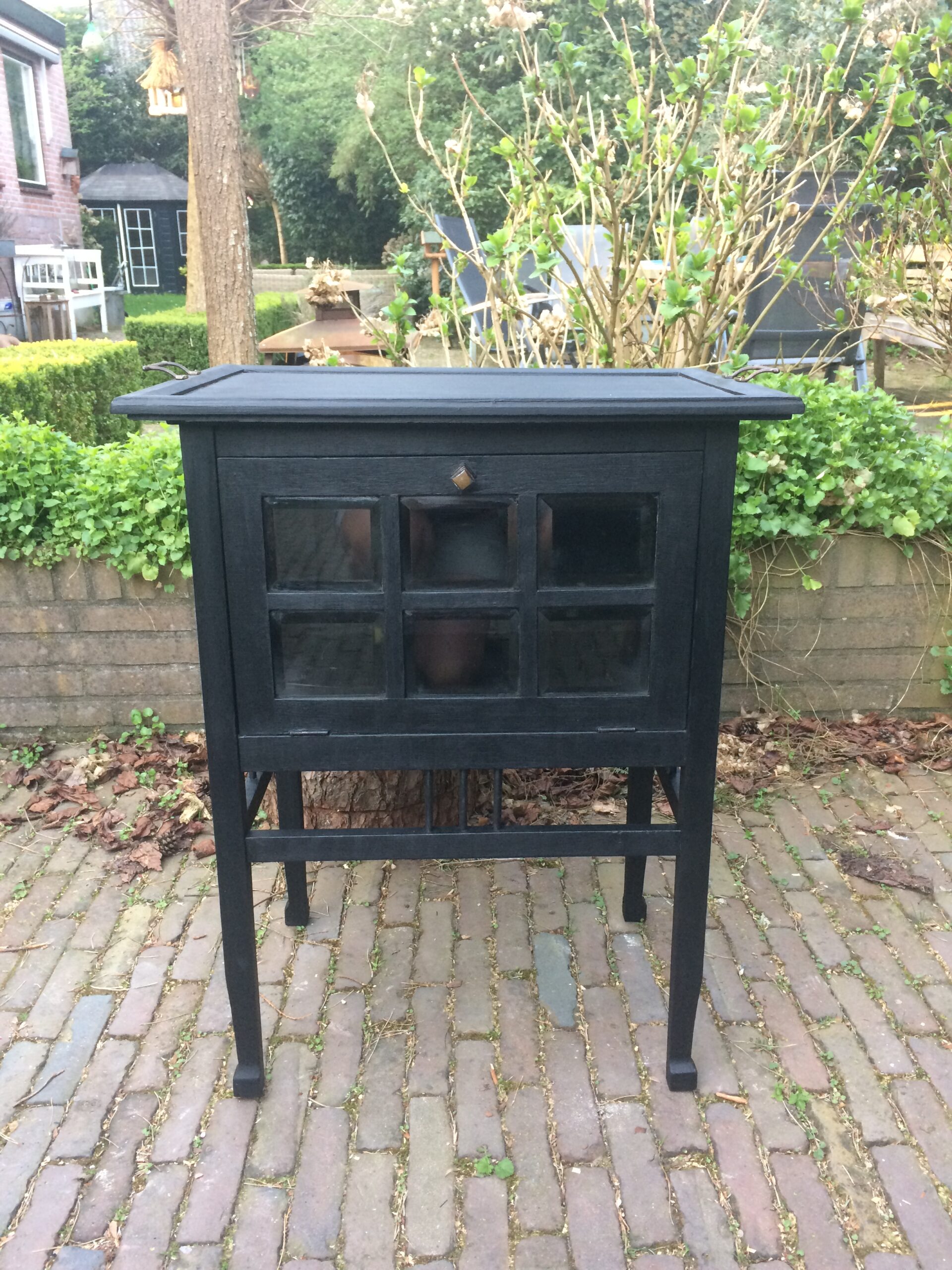 Oud theemeubeltje gekocht door Githa. Was nog een heel project, zo klein als het is. Vooral die kleine ruitjes kostten veel tijd, maar hij is mooi geworden. En de stoelen van Noortje van bruin naar zwart.